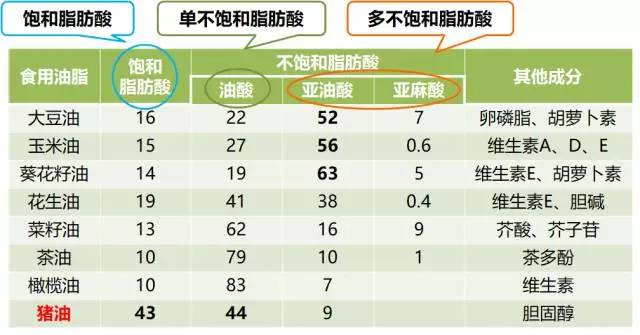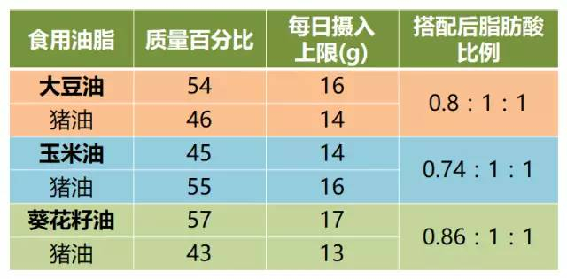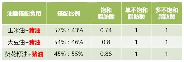 “自然界没有任何一种天然植物油或动物油脂能达到或者接近3种脂肪酸1∶1∶1完美平衡,要达到脂肪酸均衡摄入,烹饪时,必须将天然植物油和动物油脂搭配食用。猪油与常见的植物油荤素搭配,不仅口感好,少用1/3的油,且其3种脂肪酸比例趋近1∶1∶1,特别是豆油和玉米油。”文利新说。