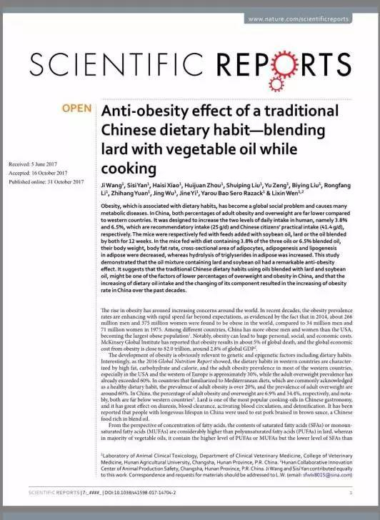 英国时间10月31日,湖南农业大学文利新教授及其团队成员王吉、严思思等人的最新科研成果《中国传统饮食习惯——猪油与植物油搭配食用的抗肥胖作用》,在英国自然出版集团(Nature)旗下的《科学报告(《Scientific Reports》)上发表。《科学报告》杂志在国际科学研究领域具有较高影响力,杂志专注于发表多学科交叉的研究。