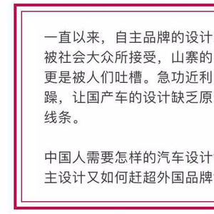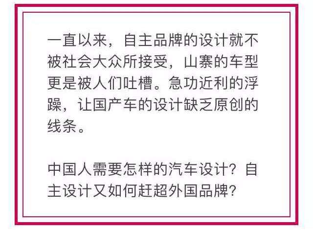 张雪龙总设计师的观点和大师不谋而合:刻意寻找中国设计的模板并没有意义。当中国汽车原创设计一天天强大起来,当有朝一日能够出现一款受到全球欢迎的中国车型,“中国设计”自然而然就会以更鲜明的姿态呈现。