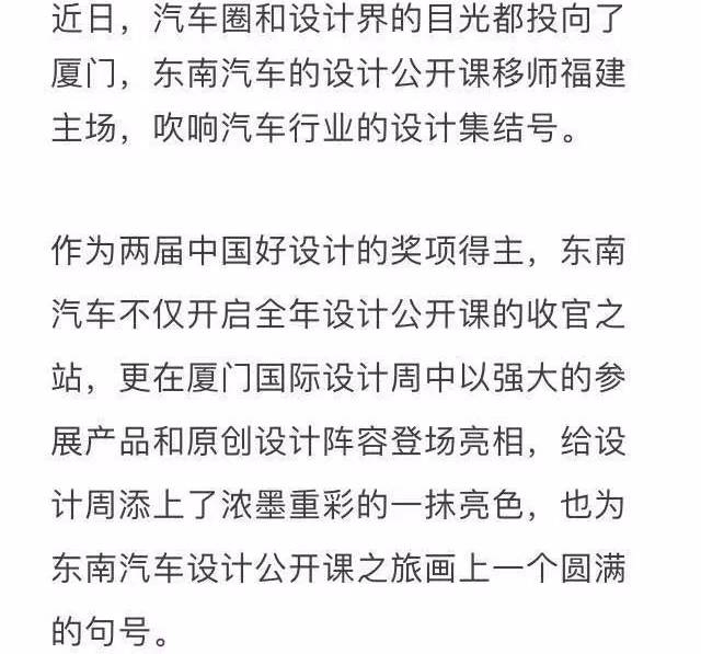 接下来,东南汽车将怀抱着对“原创设计”的坚定梦想,赋予设计公开课更加丰富的形式和内容,以大众化语言解读设计理念,进一步强化东南汽车在原创设计上的领先地位,把设计公开课打造成东南特色的品牌活动,为中国汽车市场带来更多惊喜,让世界见证一个更加自信、魅力的“美丽新东南”。