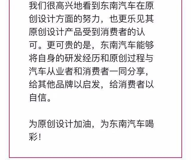 在公众更加了解东南汽车原创设计的同时,东南汽车也呼吁更多人来关注中国汽车工业原创设计的发展,推动中国汽车品牌逐步走上国际舞台。