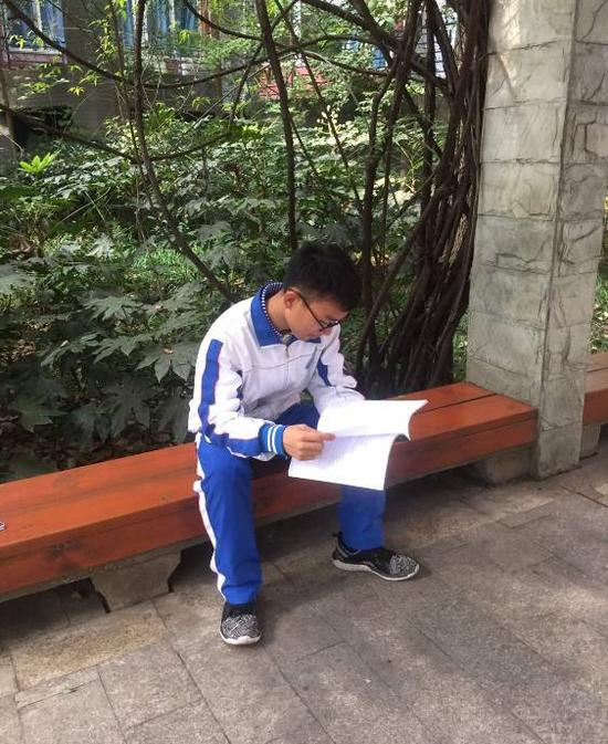今年15岁的严祖怀是四川成都高新和平学校有名的“学霸”。今年六月的中考,他以全校指标到校总排名第一的成绩考入成都七中林荫校区,该校是全成都市中考收分最高的高中。