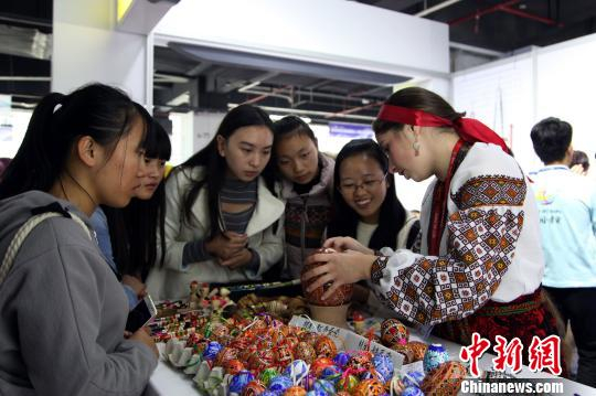 图为乌克兰参展商正在给顾客介绍鸵鸟蛋壳的来源。 瞿宏伦 摄