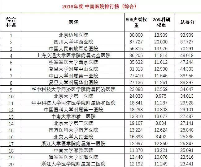 北京协和医院、四川大学华西医院、解放军总医院继续名列排行榜前三甲