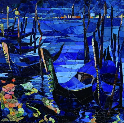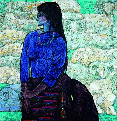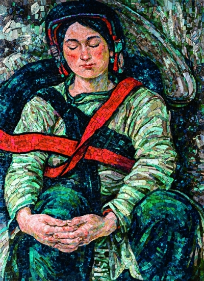 本次展览中,唐小禾的《孙中山先生》、孙景波的《撒尼母亲》是用镶嵌语言表现具象写实类题材的优秀之作,无论是画面布局的整体走向,还是人物的形体结构,都经由嵌块的组织得以完美呈现。李化吉的《牧羊女》、刘秉江的《瑞丽江畔》和程犁的《凤兮·凰兮》,则使用更为自由的料器切割等镶嵌语言和综合材料并置等方法将富于装饰风格的作品充分传达。郗海飞的《山影》和贺亮的《无限》《生长》等抽象风格的作品,则更有利于展现马赛克本身独特的材料语言和技术语言,画面奔放、表现性极强。
