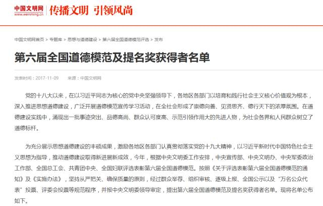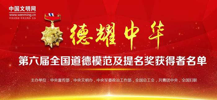 近日,中国文明网公布第六届全国道德模范及提名奖获得者名单,全国共58人获第六届全国道德模范称号,265人获第六届全国道德模范提名奖。