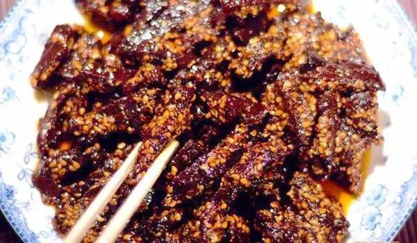 孝泉"果汁牛肉"是孝泉的特色美食,有甜味和辣味两种,吃起来有点苹果或者梨的味道,牛肉酥脆而不顶牙,入口嚼一下就化渣。
