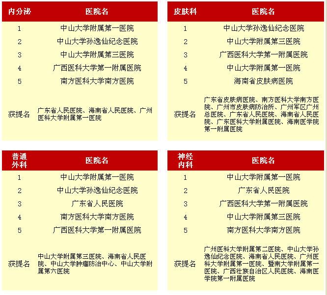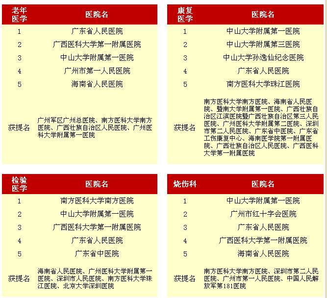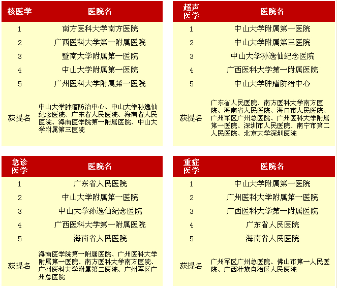 中山大学附属第一医院依然斩获最丰,一共有病理科、耳鼻喉科、放射科、妇产科、内分泌、普通外科、神经内科、肾脏病、消化病、康复医学、超声医学、急诊医学、重症医学等13个专科进入排行榜前十名;