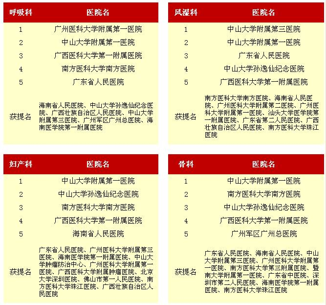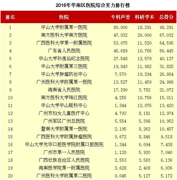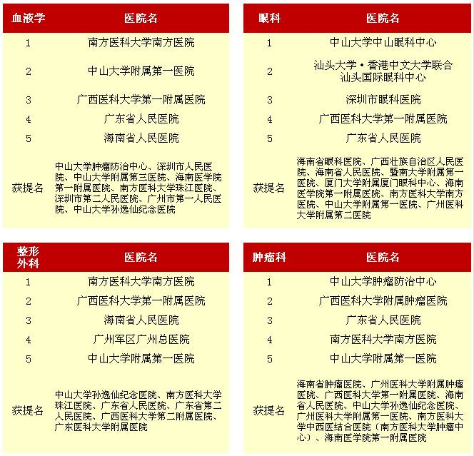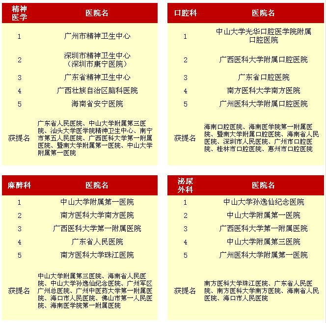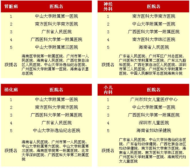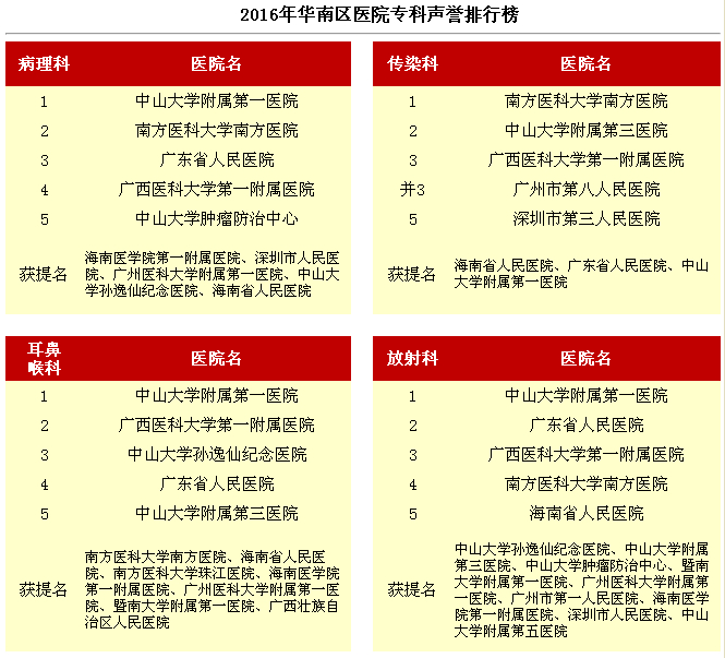 2016年华南区医院专科声誉排行榜(向下滑动阅览)