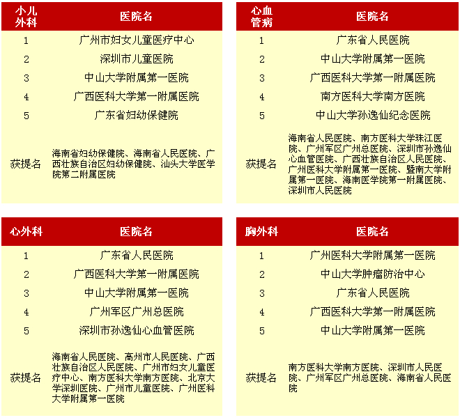 广东进入全国专科前十名的其他专科有:中山三院的风湿科;广州市妇儿中心的小儿外科;广州医科大学附属第一医院的胸外科;中山大学附属肿瘤医院的胸外科与肿瘤学。