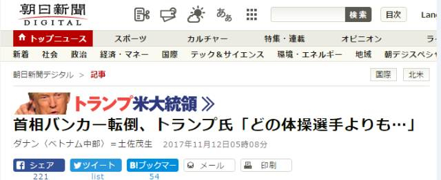 ▲《朝日新闻》题为“首相摔倒、特朗普说比任何体操选手都要...”的文章