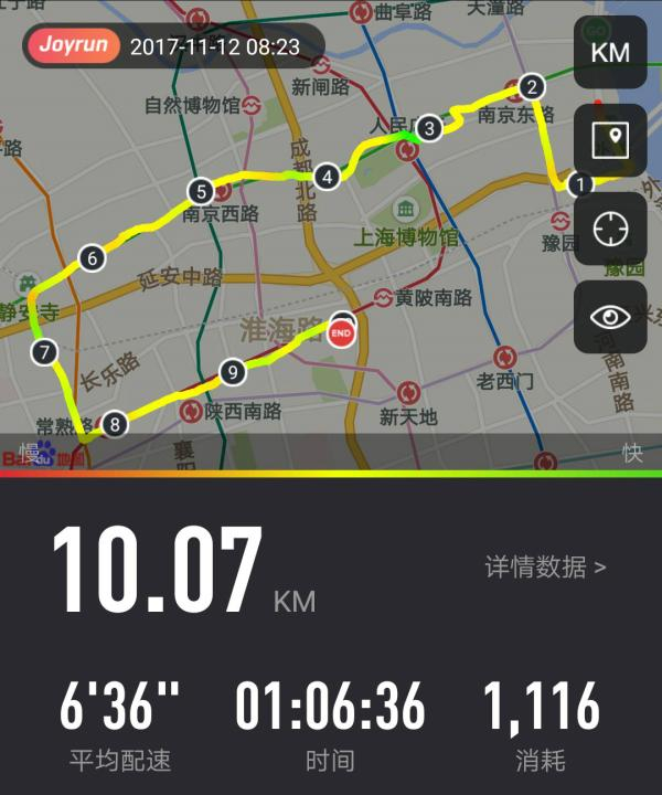 第二公里进入南京路后,队伍差距渐渐被拉开,我也逐渐将注意力转移到了身体之外。看着熟悉的南京路,这竟是自己第一次从这里跑过,甚至出现了一种不真实的感觉。