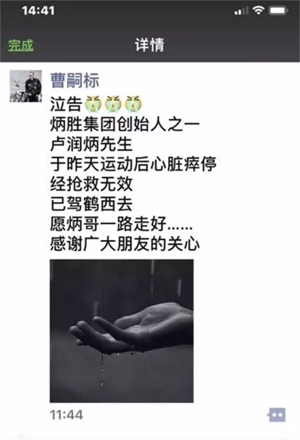 今日中午12点,炳胜集团董事长曹嗣标在朋友圈发出泣告,证实此事。