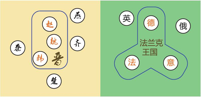 法、德、意三国比较类似于战国时期的赵、魏、韩三国。后者是春秋晚期三家分晋的产物,前者则是法兰克王国一分为三的产物。
