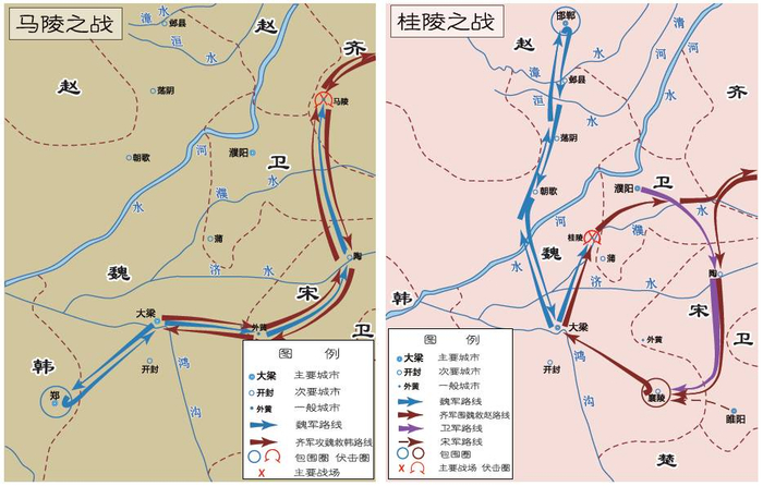 ▲马陵之战(围魏救韩)和桂陵之战(围魏救赵)示意图