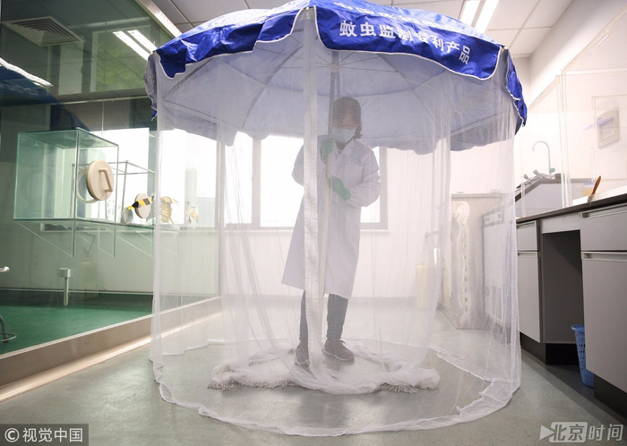 专家们需要站在帐子中,露出一条腿做诱饵来检测蚊虫叮咬指数。