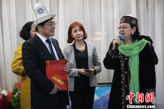 扎米拉代表吉国妇女联合大会向《丝路新观察》报社赠送了代表吉国传统的毡帽,以及最新出版的《吉尔吉斯杰出妇女》一书。这本书收录了包括吉国第一夫人拉依萨·阿坦巴耶娃、中国驻吉国大使夫人刘阳在内的400多名杰出女性。