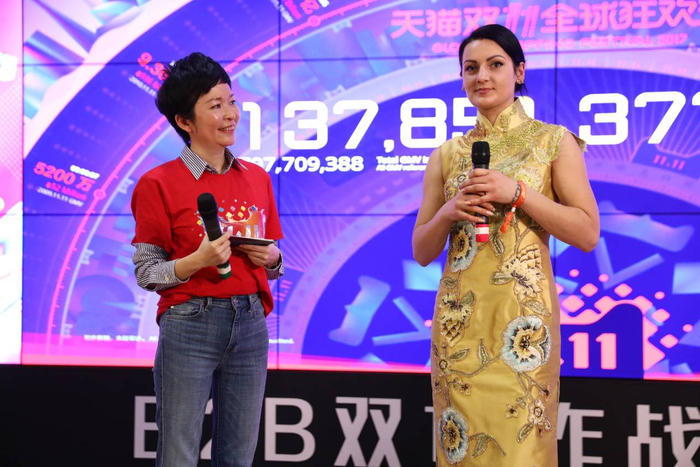玛利亚把这件精美的金黄色旗袍穿进了演播厅里,在面对阿里巴巴B2B事业群总裁戴珊时,玛利亚说,这次来中国,她看到了太多前所未有,感受到科技的力量,和一份伟大的事业。(品牌)