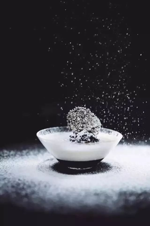 一改普通杏仁茶的单一口味和颜色,罗丹尝试用龟苓膏打底,再铺一层雪白的杏仁酪,在酪上点缀两勺黑米,最后冠以一片形状随意的黑芝麻糖脆。既创新了造型,又丰富了口感;既是视觉上的美,也成就了味蕾的享受。