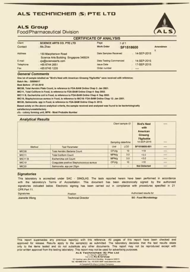 这款燕窝来自新加坡,是同仁堂旗下产品,公司董事长陈立发是新加坡中国医药保健品商会会长。新加坡总统曾亲自颁发PBM公共服务奖章,集团有着苛刻的品控标准。