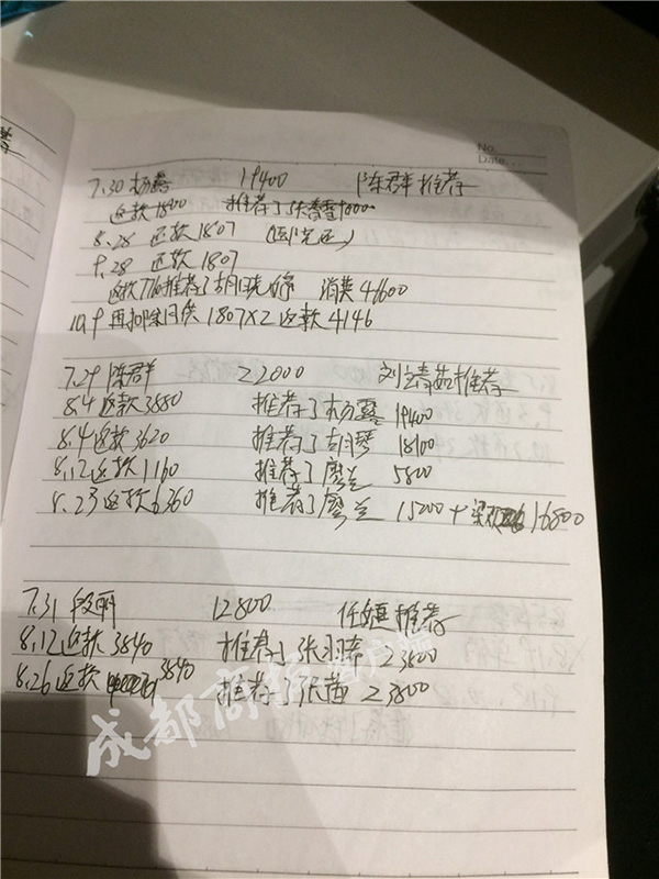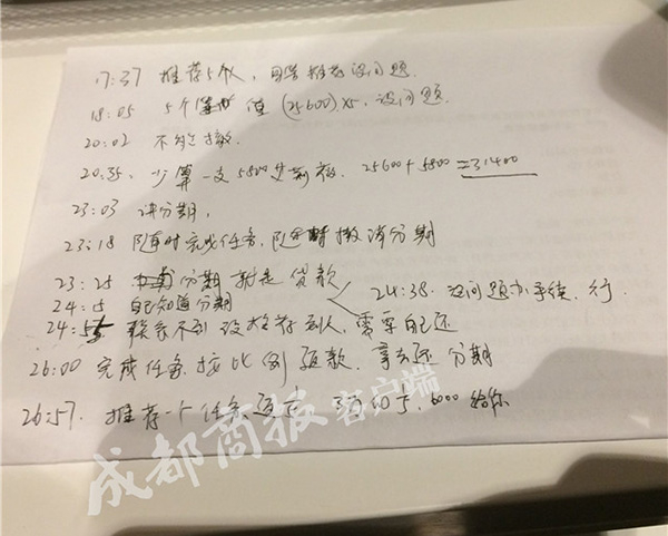 记录本还详细写明了说服一个客人的时间表:咨询进行到15分37秒时,告知客户需要推荐5个,客户回答推荐没有问题;18分05秒时,确认客户金额为两万多,5个推荐客户;20分02秒告知客户,分期不能撤销;23分18分秒告知客户,分期就是贷款,随时完成推荐任务随时撤销分期……以这个案例计算,整个咨询耗时26分钟57秒,其中分期、还款以及完成任务的计算方式与记者得到的咨询内容完全一致。