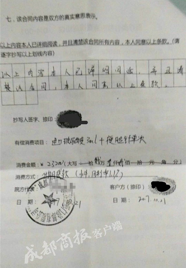 小文告诉成都商报客户端记者,工作人员随后拿出一张表格进行登记,“表格的标题是‘小牛分期’,工作人员说这是一个保证书,填写目的是防止我在免费接受整形后不按照约定为他们推荐顾客。”小文自称,工作人员在未告知她的情况下,在表格上工作、收入栏随意捏造了信息,并在回访信息一栏中填下:不希望家里人知道,请以签收快递方式询问,“他填完之后才给我看的。”