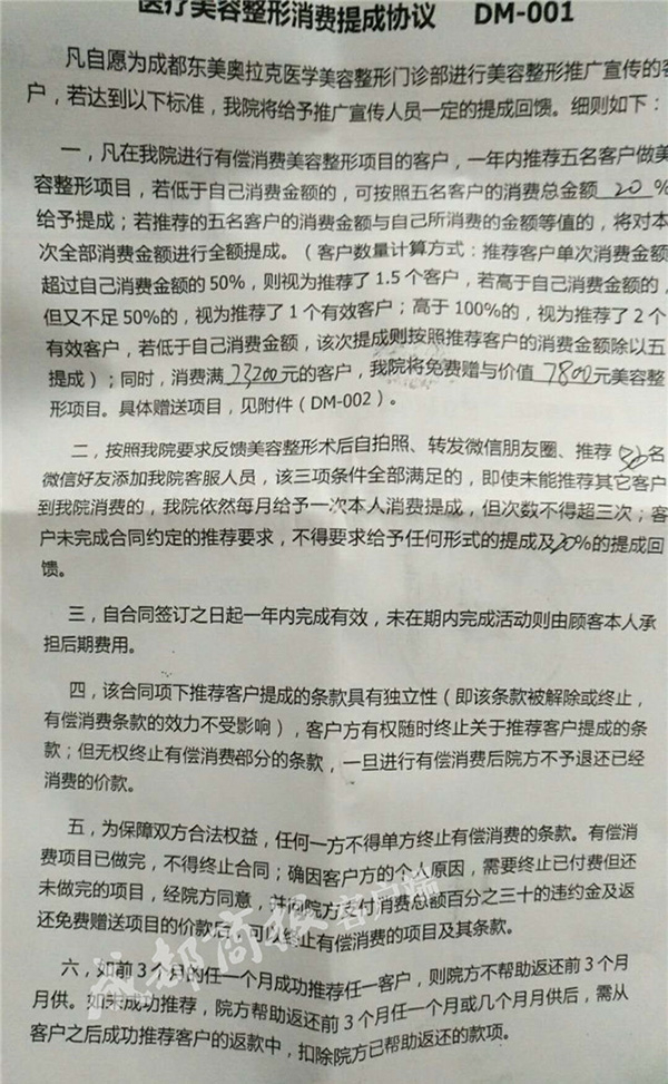 7日,小文向成都商报客户端记者展示了自己手中的一份“协议”。 记者发现,这份名为《医疗美容整形提成协议DM—001》的协议,既像DM单,又像合同。