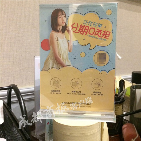 “如果一个平台通不过,我们会推荐其他平台,但是我们一般都推荐用易美健,因为这个平台利息最低(一万元1个月75元)。”聂琦说,这种贷款利息虽然很低,但是贷款商家只跟医院合作,不会跟个人合作,这个钱只能到医院账户,不会到个人账户。“如果易美建申请不成功,我们会推荐小牛分期等其他平台,不过其他平台的贷款利息就比较高了。”聂琦说。成都商报客户端记者在东美整形看到,提供有“美好分期”“呜咔熊分期”的二维码。