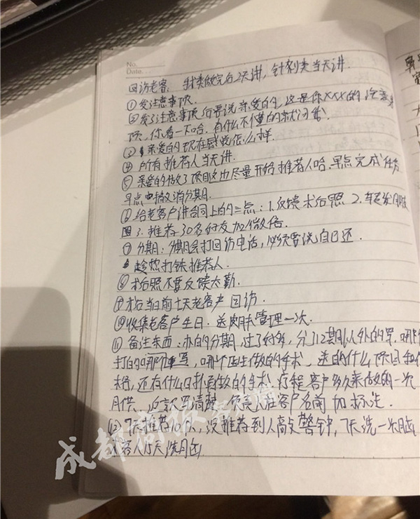 暗访过程中,记者在一个咨询室意外地发现了一本东美工作人员的工作记录本,里面详细记录了如何“洗脑”客户,记者拍摄到其中20页的内容。