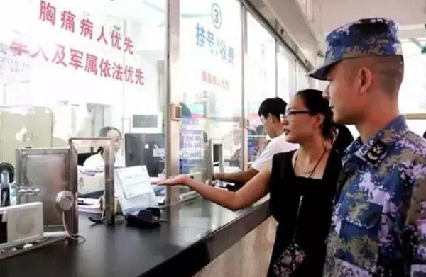联勤保障部队成立之后,武汉联勤保障基地印发《加强联勤保障部队医院为部队服务工作措施》,要求所属医院向军人配偶及子女、父母等直系亲属开放挂号、取药、检查等军人优先服务区域,统一设置“军人及家属优先”“军人及家属窗口”醒目标识,主动提供优先医疗服务,充分体现军人职业荣誉感。沈阳联勤保障中心专门下发通知进行细化,并指导210医院在海岛部队进行“军属就医优先卡”试点。