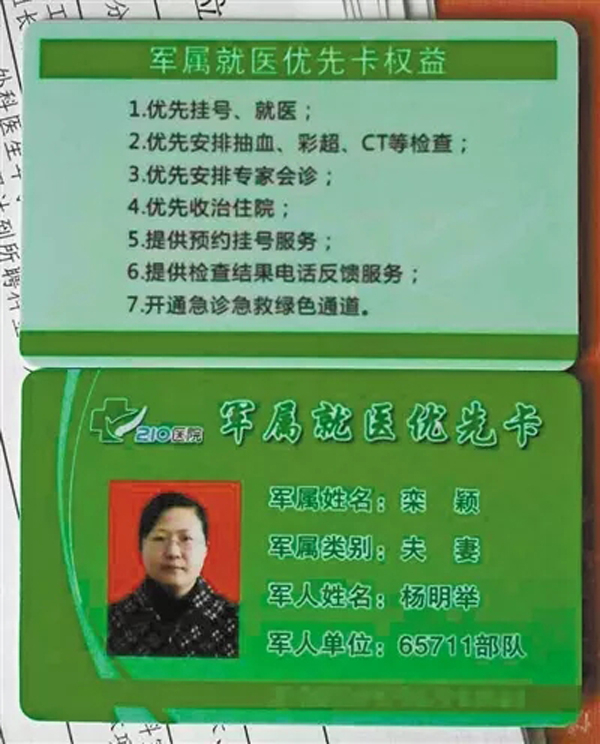 “军属就医优先卡”的正面,是持卡人的照片、姓名、身份证号以及军人姓名、单位等信息,背面印有优先挂号、住院等7条军属就医优先权益。