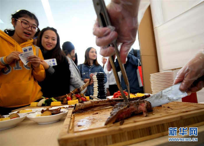 11月11日,上海理工大学食堂的人气菜“烧烤牛排”亮相现场。当日,以“青春饭,不浪费”为主题的“第一届上海大学生美食节”活动在复旦大学开幕,15所高校的人气美食集中亮相。