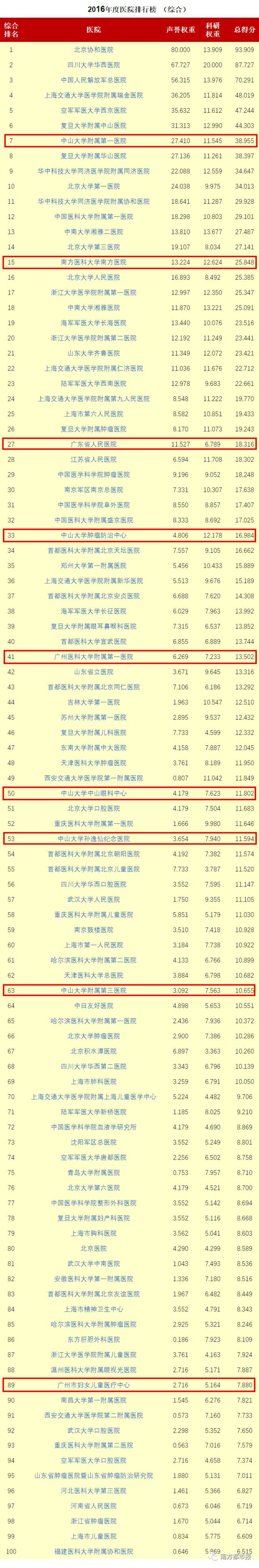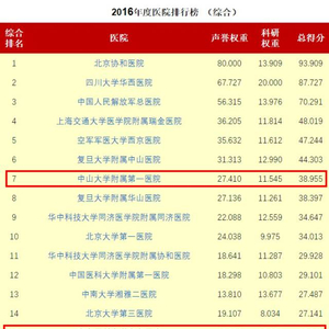在2016年的榜单中,广东有9家医院进入综合排名前100,与去年持平。中山大学附属第一医院名列第7位,与去年一致,也是广东省在全国综合排名最靠前的医院。