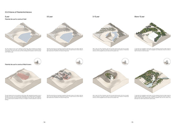 在内金刚,对关键点前的遮挡物进行了处理,具体方式是重新种植不同高度的植被,来清理关键点前的遮挡物。植被的选择依据当地人如何利用土地,比如,朝鲜人利用该地区的部分土地进行水稻及人参的种植来获取更高的经济效益。我的设计策略是找出该地区适宜水稻以及人参生长的区域,合理规划土地,避免森林开垦过度,以保证该地区的生态系统。