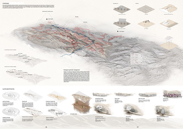 我的毕设获得了由北京大学建筑与规划设计学院、中国建筑工业出版社和景观学与美丽中国建设专业委员会主办,由景观中国网、《景观设计学》承办的第十三届全国高校景观设计毕业作品展——LA先锋奖的模型与表达奖。除了独特的选址和命题,评委还非常喜欢图面表达出的东方艺术。在我看来,景观建筑学科的表现手法与审美通常按照西方国家的标准。所以,我希望能在制图中体现出东方文化的味道。我的大部分图纸是画出来的,也结合了中国山水画大透视的表现方法和白描的展现形式。