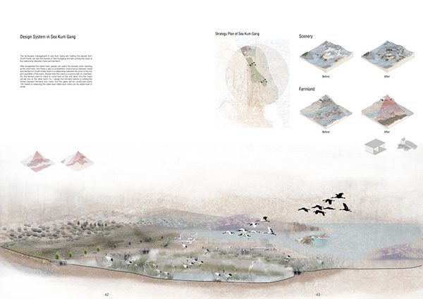 在海金刚,我发现水稻有非常高的价值,因为该地区是丹顶鹤的栖息地,丹顶鹤不仅是韩国期盼“和平”的象征,也代表着该地区生态系统环境很好。所以,这里的水稻被认为无污染,品质高。但是丹顶鹤会吃水稻,也使得水稻的产值较低。所以,我的设计策略是用利用地理数据,找出丹顶鹤的栖息地,然后在丹顶鹤经常栖息的湿地中建立沙洲,增加屏障,阻隔丹顶鹤进入稻田的途径。最终,平衡丹顶鹤与水稻产值之间的关系。在保护丹顶鹤栖息地的同时,提高粮食产量。