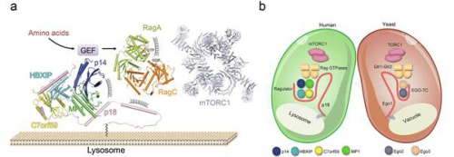 a.Ragulator复合物招募Rag小G蛋白和mTORC1复合物在溶酶体上定位的工作模型;b.人源Ragulator复合物和酵母Ego1-Ego2-Ego3复合物结构上非常相似,表明这两个复合物在mTORC1/TORC1信号通路中发挥相似的功能。
