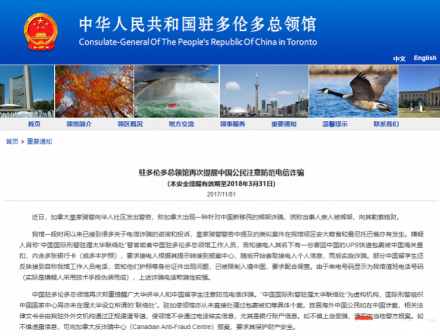 中国驻多伦多总领馆的防诈骗提醒