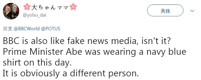 据悉,在英国广播公司BBC发布的来自东京电视台的“安倍摔跤”视频下方,一位名叫“大酱妈妈”的日本网友就怒怼称:“BBC就像个假新闻媒体一样,不是吗?安倍首相当天穿着一件海军蓝T恤,很明显(和摔倒的)不是同一个人。”她还上传了几张照片作对比,图片也显示,视频中摔倒的人身着白色上衣,明显与媒体随后给出的美日两国首脑高尔夫球场合影不同。“通过衣服判断,我认为视频中和特朗普一起走的那个才是安倍首相。”