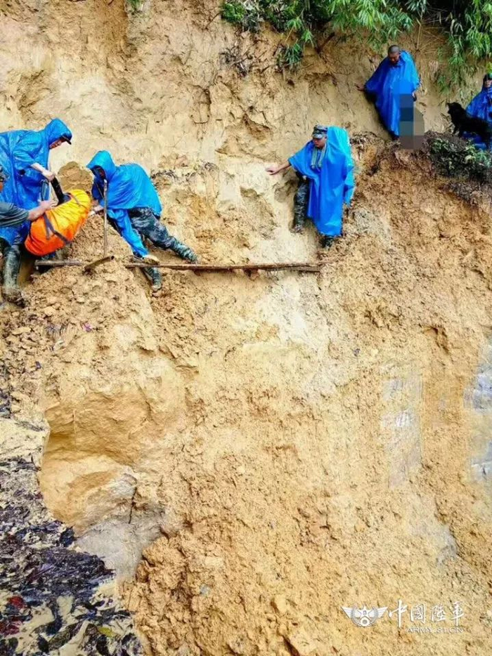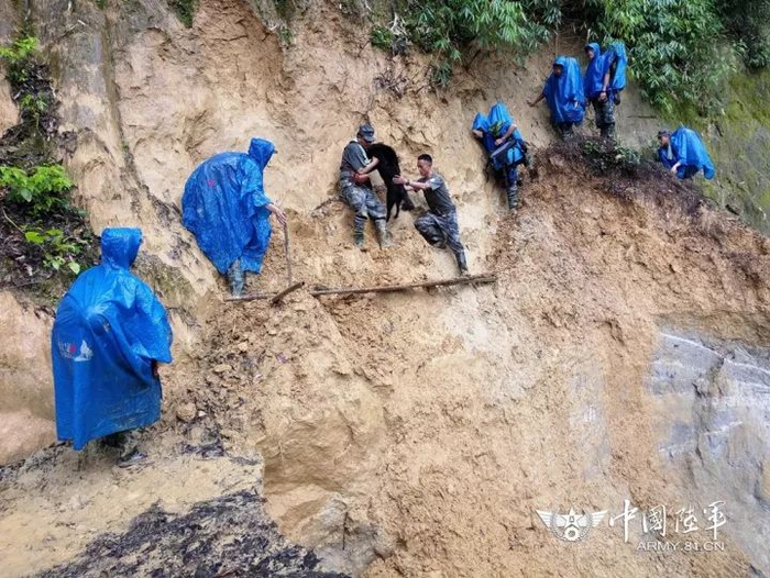 ▲腰里系着保险绳,由战友拉着,慢慢爬过泥泞的陡崖。