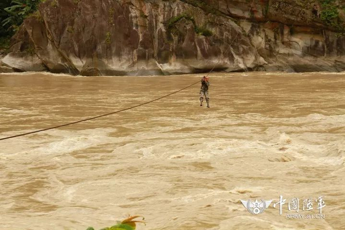 ▲巡逻通过卢公河上的溜索桥。