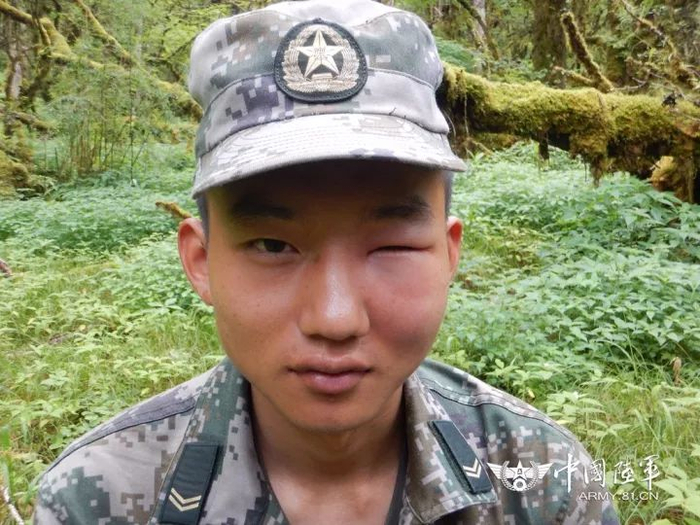 ▲一名眼睛被毒蜂蛰了的战士。