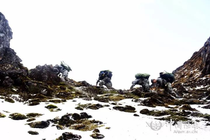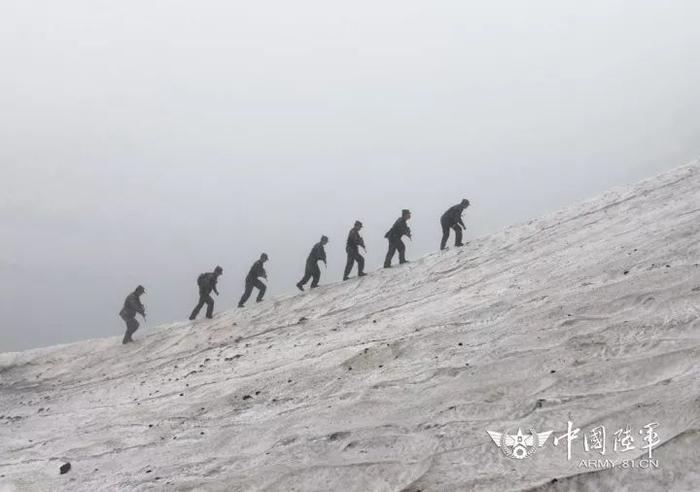 ▲官兵手脚并用爬雪山(右三为梁昆炜)。