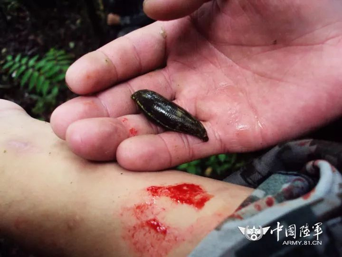 ▲巡逻路上,战士被拇指般粗的蚂蟥叮咬。