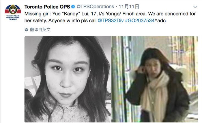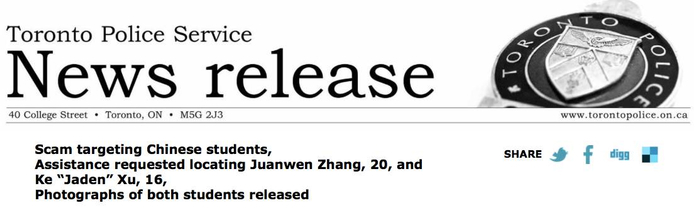 11月10日中午,警方发布了对上述两名多伦多留学生失踪的调查通知,确认两人均为专门针对中国人的诈骗案件受害者。