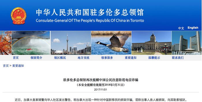 值得注意的是,中国驻加拿大多伦多总领馆曾在11月1日向当地华人发出警告称,加拿大近日出现一种新的诈骗形式,具体做法是先谎称当事人亲人被绑架,然后向其勒索钱财。