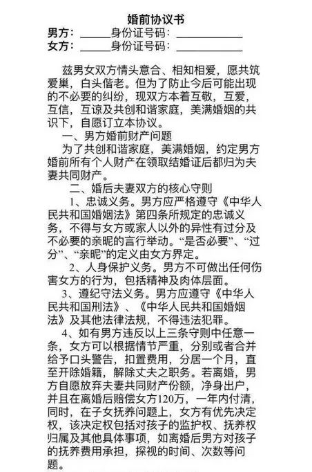近日,网上一份新人婚前协议书引发热议。协议里,新娘列出5大条共18小条规定和守则,据悉新郎看过协议后心灰意冷,在“双11”领证当天表示:这婚不结了。原定12日的婚宴也被迫取消。