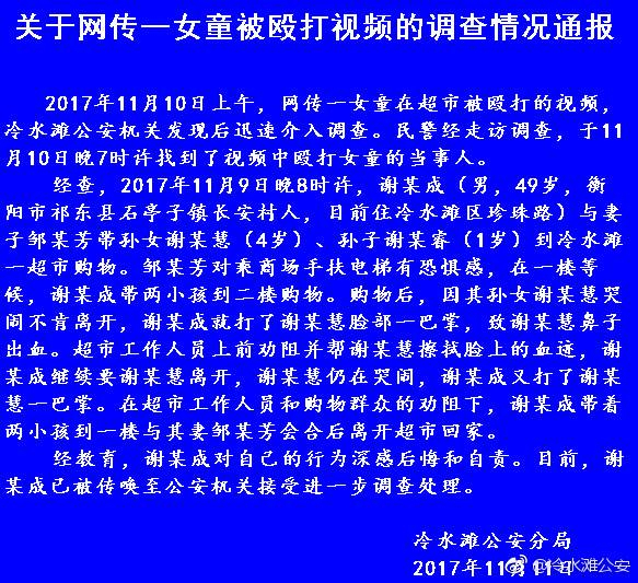 11日,永州市公安局冷水滩分局官方微博发布调查情况通报,被打女童其实是男子的孙女。