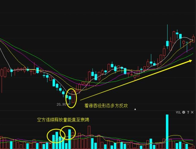 看张吞没形态是市场多方强势的信号。一般在股价下跌一段时间后,突然出现一根中、大阳线反包前几日的阴线,或者至少是右面的单根阳线实体完全盖住左面的单根阴线实体。