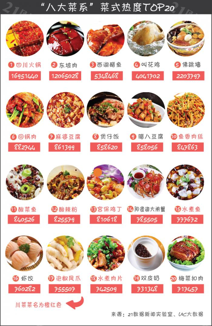 不仅如此,UC大数据还显示,在热度最高的20款菜式中,川菜占据了一半的席位,且四川名片“四川火锅”在21数据新闻实验室精选的近千款菜式(包括著名小吃甜品)中,热度遥遥领先。
